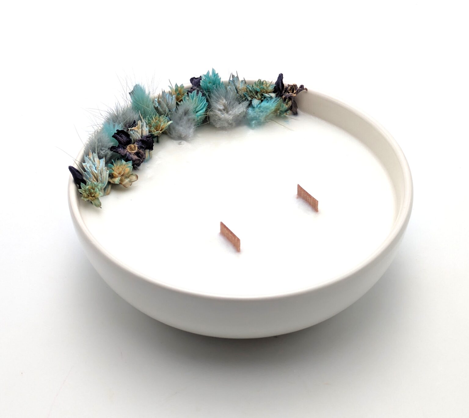 Les mèches sont volontairement décentrées afin de préserver les fleurs séchées et de garder la bougie esthétique jusqu’à la dernière lueur. Toute la cire ne se consumera pas entièrement : c’est un choix assumé, pour que votre bougie reste jolie le plus longtemps possible.