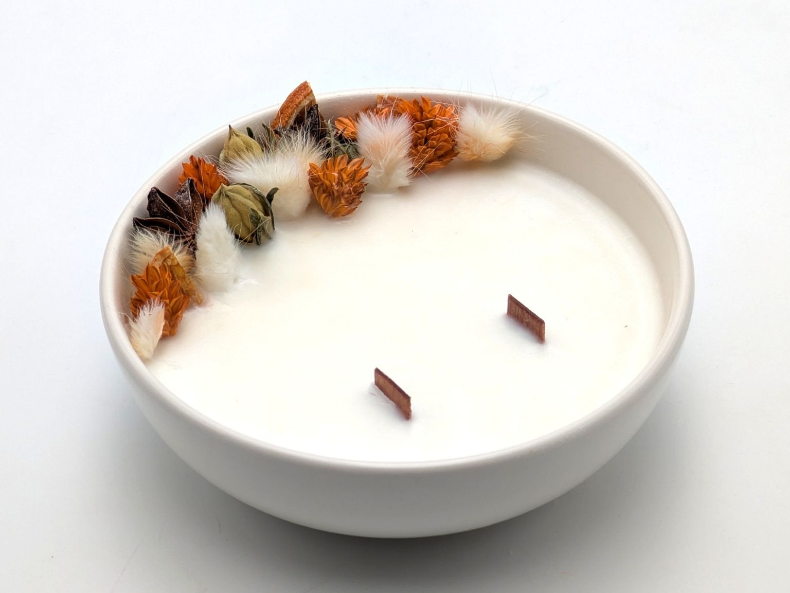 Les mèches sont volontairement décentrées afin de préserver les fleurs séchées et de garder la bougie esthétique jusqu’à la dernière lueur. Toute la cire ne se consumera pas entièrement : c’est un choix assumé, pour que votre bougie reste jolie le plus longtemps possible.