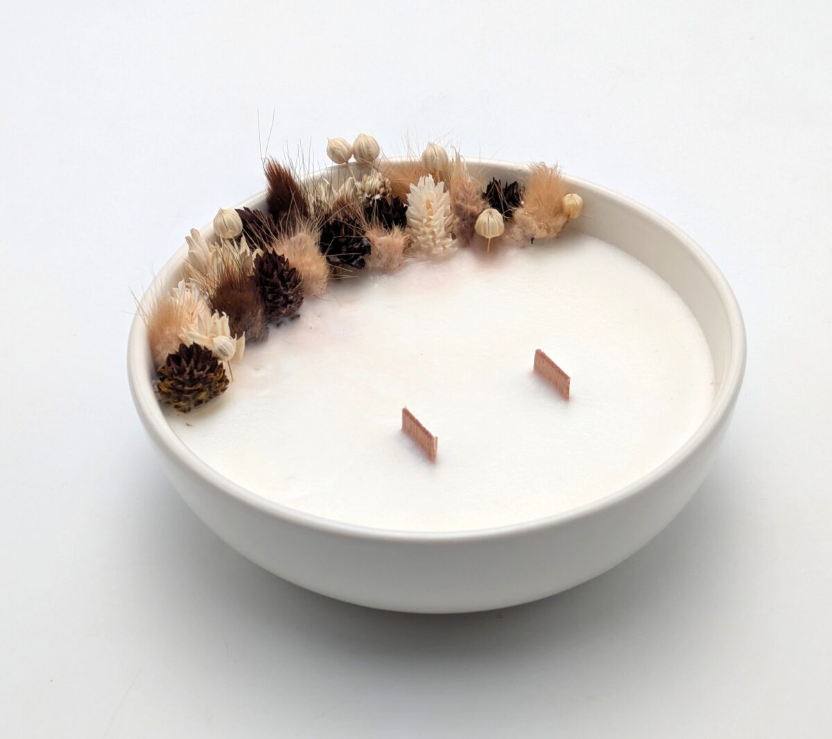 Ce qui fait tout le charme de cette bougie, c’est la décoration de fleurs séchées, choisies pour leurs tons chauds et leur texture délicate.