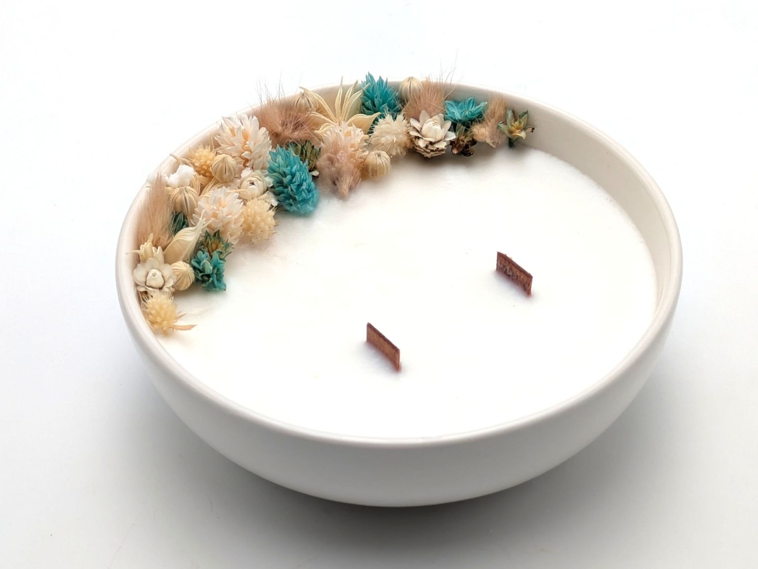 Les mèches sont volontairement décentrées afin de préserver les fleurs séchées et de garder la bougie esthétique jusqu’à la dernière lueur. Toute la cire ne se consumera pas entièrement : c’est un choix assumé, pour que votre bougie reste jolie le plus longtemps possible.