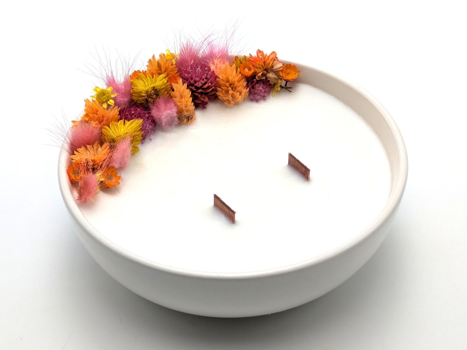 Les mèches sont volontairement décentrées afin de préserver les fleurs séchées et de garder la bougie esthétique jusqu’à la dernière lueur. Toute la cire ne se consumera pas entièrement : c’est un choix assumé, pour que votre bougie reste jolie le plus longtemps possible.