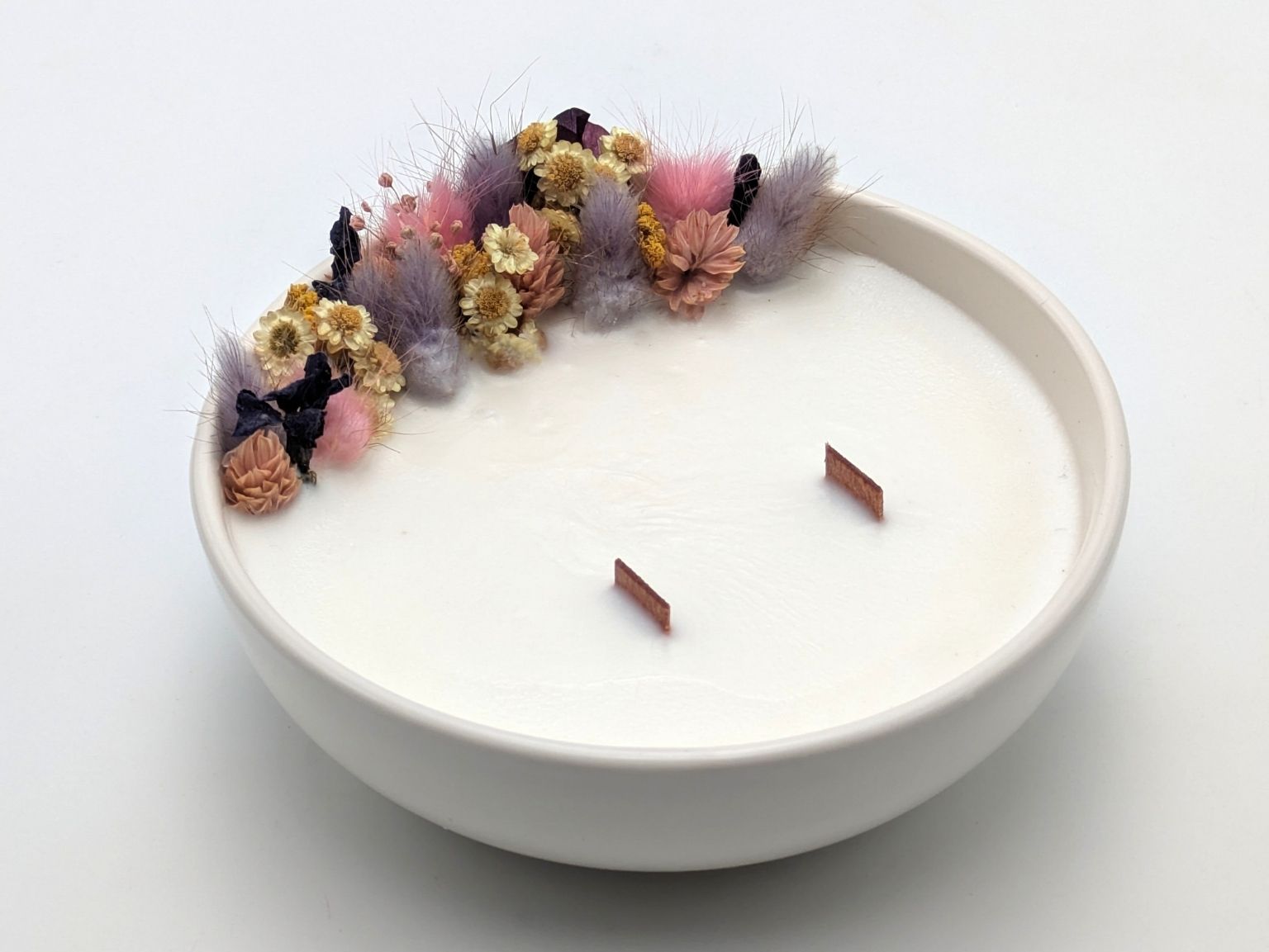 Ce qui distingue cette bougie, c’est sa décoration réalisée avec des fleurs séchées. En effet, elles sont choisies avec soin pour leur couleur et leur texture, ajoutant ainsi une touche naturelle et élégante à la bougie. Contrairement aux bougies traditionnelles, les fleurs séchées restent intactes pendant la combustion, offrant ainsi une décoration durable et originale. Par conséquent, vous pouvez apprécier non seulement la fragrance, mais aussi la beauté visuelle de ce produit.