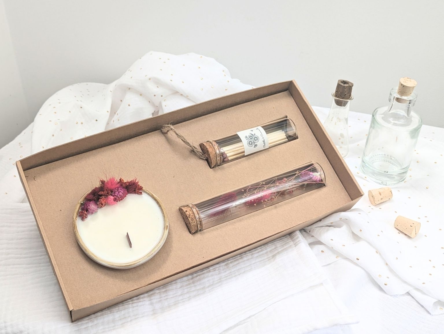 Le coffret comprend également une fiole décorative de fleurs séchées d’un rouge vibrant. Ces fleurs apportent une touche de couleur intense et chaleureuse, parfaite pour ajouter une note de sophistication à votre intérieur. Le rouge symbolise la passion et l’élégance, et les fleurs séchées apportent une texture naturelle et intemporelle. Elles sont idéales pour compléter la décoration de votre maison, en créant une atmosphère accueillante et pleine de caractère.
