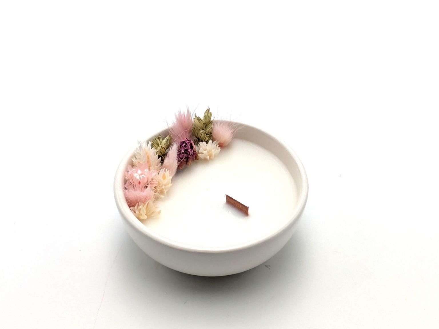 Les mèches sont volontairement décentrées afin de préserver les fleurs séchées et de garder la bougie esthétique jusqu’à la dernière lueur. Toute la cire ne se consumera pas entièrement : c’est un choix assumé, pour que votre bougie reste jolie le plus longtemps possible.